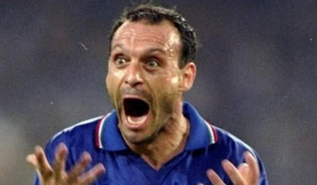 Pur non interessandomi minimamente di calcio, sono uno di quelli che ogni biennio (le occasioni si stanno diradando ultimamente) partecipa a quel rito collettivo chiamato "partita dell'Italia": il primo Mondiale di cui ho ricordi è proprio Italia '90, quello delle Notti Magiche, quello dell'orribile mascotte Ciao, quello che nessuno si spiega come cazzo abbiamo fatto a perdere. Totò Schillaci, capocannoniere del torneo, assurto a inaspettato "eroe" del Mondiale stesso (partì come panchinaro), me lo ricordo bene, nonostante i miei ott'anni d'età. Anche gli irlandesi se lo ricordano. Finito il Mondiale, PUFF, sparito nel nulla, nessuno ne ha più sentito parlare. Io di sicuro. A quanto vedo, negli ultimi anni s'è fatto trapiantare dei capelli e dei baffi orrendi e ha partecipato a varie trasmissioni trash e reality assortiti; ha inoltre "recitato", nel ruolo del cane di un boss mafioso, nella serie Squadra Antimafia 3, nientemeno.